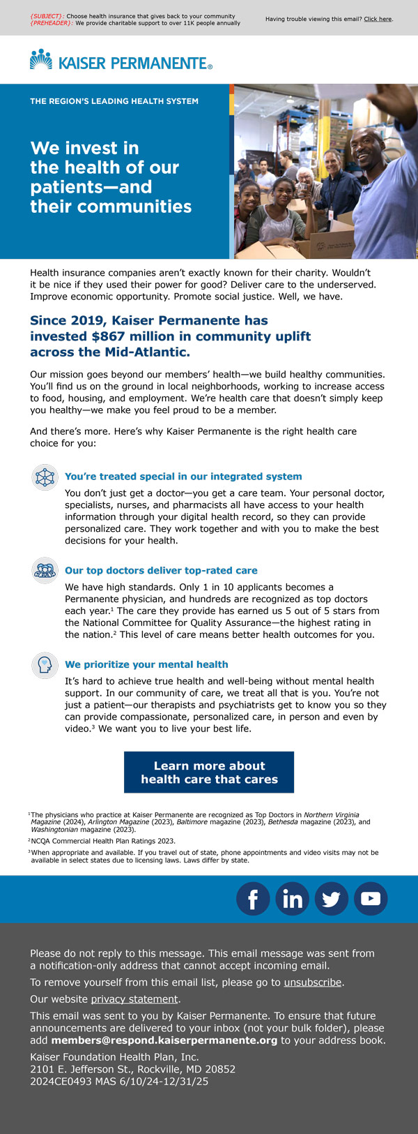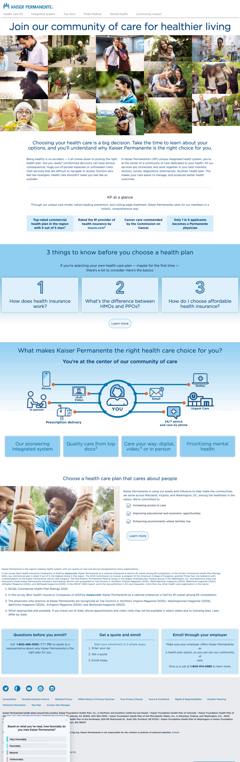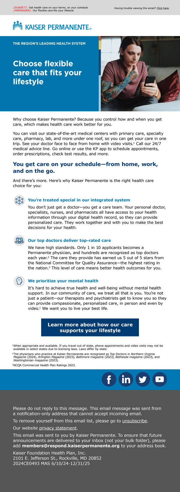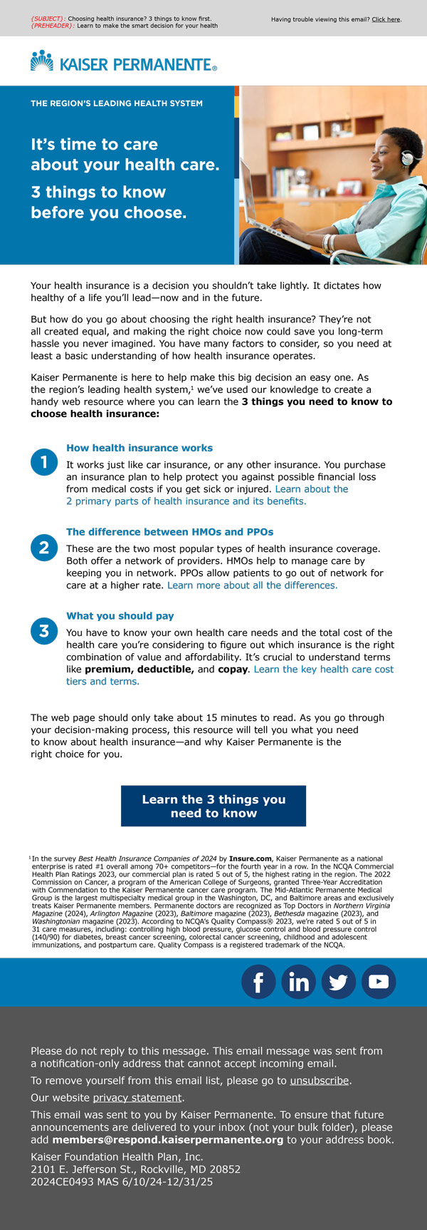 Kaiser Permanente of the Mid-Atlantic States (KPMAS) implemented a successful messaging strategy to attract high-value, new to the health care market prospects and promote KP as their preferred healthcare provider. The campaign resulted in a more positive perception of KP among the target audience, increased willingness to consider KP for insurance coverage, and better understanding of KP’s unique care model. This targeted approach aimed to establish lasting connections with potential entrants into the health insurance market, ensuring a sustainable revenue stream for Kaiser Permanente.